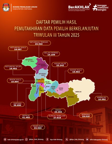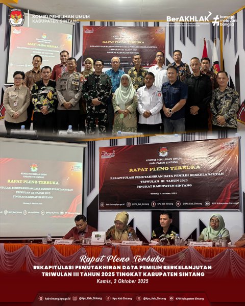 Rapat Pleno Terbuka yang digelar tertuang dalam Keputusan Nomor 12 Tahun 2025 tentang Penetapan Rekapitulasi Pemutakhiran Data Pemilih Berkelanjutan Kabupaten Sintang Provinsi Kalimantan Barat Triwulan III Tahun 2025.