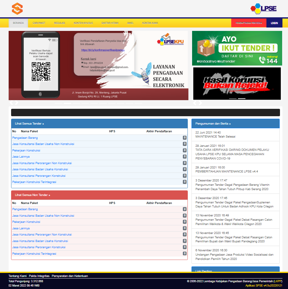 Pada Pemilihan Tahun 2020 lalu, selain melakukan pengadaan barang logistik untuk keperluan Pemungutan dan Penghitungan Suara. KPU penyelenggara Pemilihan 2020 juga wajib melakukan pembelian APD (Alat Pelindung Diri) dalam rangka pencegahan penyebaran Covid-19. Jumlah APD yang begitu banyak membuat nominal harga pembelian APD juga semakin tinggi bahkan melebihi batas Pengadaan Langsung (PL) yakni Rp. 200.000.000,-. Hal ini, membuat pengadaan harus dilakukan melalui metode tender. Aplikasi LPSE (Layanan Pengadaan Secara Elektronik) dipakai guna menghubungkan proses pengadaan melalui tender. Di KPU Kabupaten Sintang, proses pengadaan tender dilakukan melalui UKPBJ (Unit Kerja Pengadaan Barang dan Jasa) KPU Provinsi Kalimantan Barat dan KPU Republik Indonesia. Aplikasi ini juga merupakan kelanjutan dari aplikasi SIRUP, karena pelaksanaan pengumuman pengadaan sebelum penyerahan proses tender dilakukan pada aplikasi SIRUP.