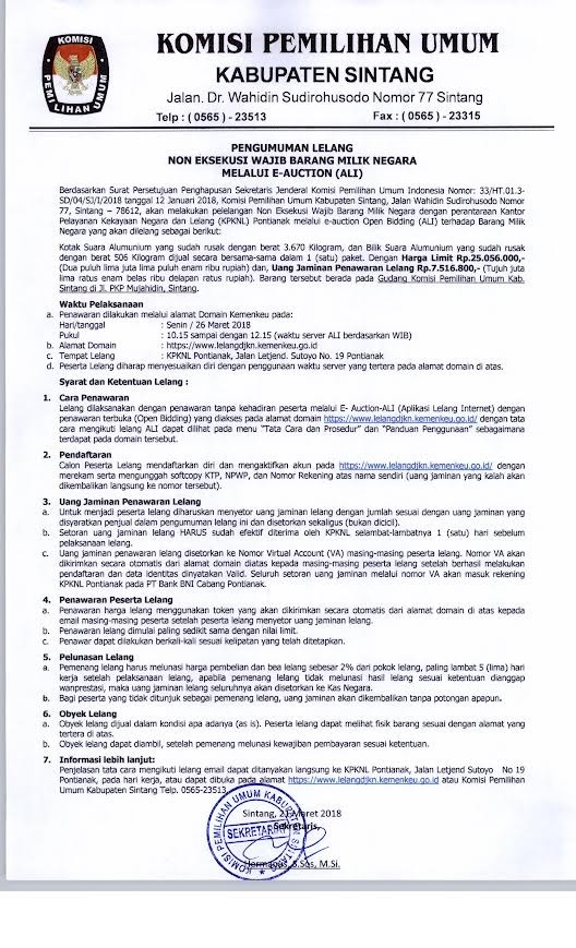 Berdasarkan Surat Persetujuan Penghapusan Sekretaris Jenderal Komisi Pemilihan Umum Indonesia Nomor :33/HT.01.3-SD/04/SJ/I/2018 tanggal 12 Januari 2018, KPU Kabupaten Sintang, Jl. Dr. Wahidin Sudirohusodo Nomor 77, Sintang-78612, akan melakukan Pelelangan Non Eksekusi Wajib Barang Milik Negara dengan perantaraan Kantor Pelayanan Kekayaan Negara dan Lelang (KPKNL) Pontianak melalui e-auction Open Bidding (ALI) terhadap Barang Milik Negara yang akan dilelang sebagai berikut: