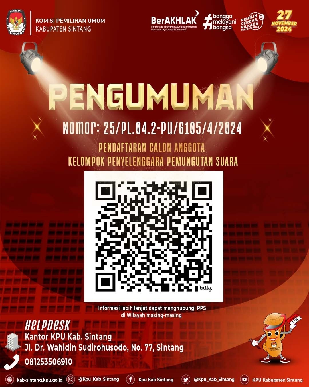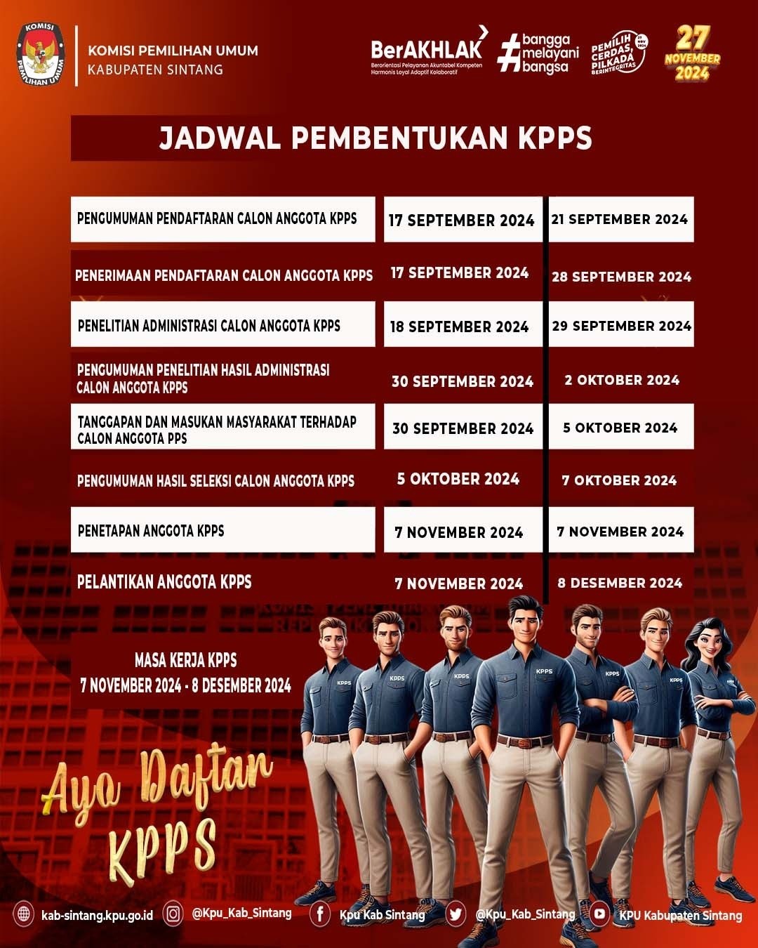 Sintang, kab-sintang.kpu.go.id - Pengumuman Nomor : 25/PL.04.2-Pu/6105/4/2024 tentang Pendaftaran Calon Anggota Kelompok Penyelenggara Pemungutan Suara untuk Pilkada Tahun 2024