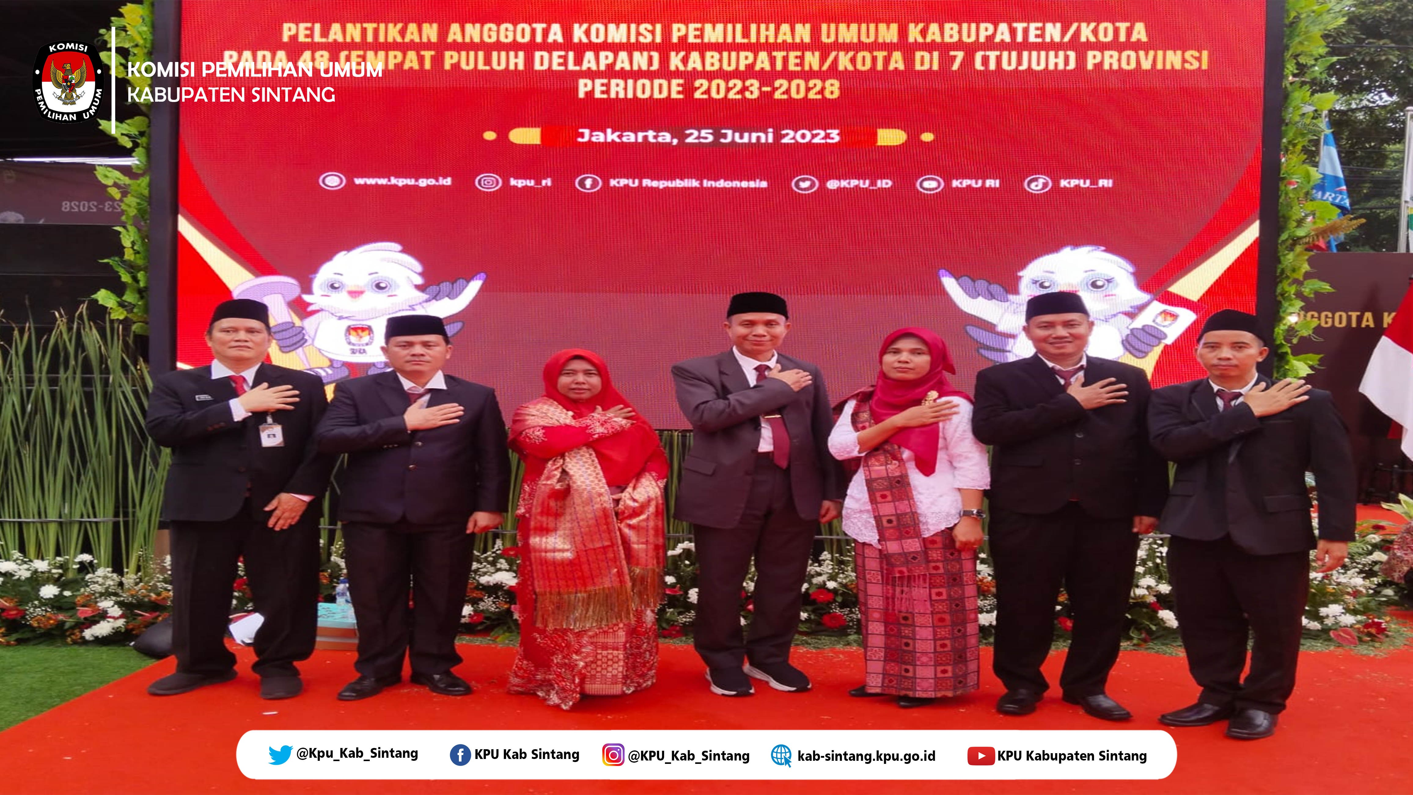 Berdasarkan pengumuman Komisi Pemilihan Umum Republik Indonesia Nomor : 57/SDM.12-Pu/04/2023, lima komisioner terpilih di KPU Sintang masa bhakti 2023 – 2028 secara resmi telah dilantik oleh ketua KPU RI Hasyim Asy’ari pada Minggu (25/6). Pelantikan di lakukan di halaman kantor KPU RI Jln. Imam Bonjol-Menteng Jakarta Pusat. Lima nama komisioner KPU Sintang tersebut masing -masing : Edy Susanto, Endang Kusmiyati, Karsinah, Slamet Bowo Santoso dan Vesius Dien. Pelantikan lima komisioner KPU Sintang ini dilakukan secara serentak bersama sekitar 240 komisioner lain yang tersebar di 48 kabupaten/kota dari 7 provinsi. Ketua KPU RI Hasyim Asy’ari dalam sambutannya mengingatkan bahwa setelah dilantik maka anggota KPU harus segera Kembali ke daerah masing-masing. Hal ini menurutnya karena saat ini tahapan pemilu 2024 telah berjalan. “Tugas sudah menanti anda semua di daerah masing-masing. Karena kita sudah memasuki tahapan pemilu 2024 yaitu tahap pengajuan perbaikan berkas bacaleg DPRD,”ingatnya. Hasyim juga mengingatkan agar setiap anggota KPU yang baru terpilih dan dilantik untuk bisa segera menyesuaikan diri. Sehingga semua tahapan bisa berjalan dengan lancar dan baik. Vesius Dien, salah satu komisioner terpilih KPU Sintang periode 2023-2028 mengatakan sangat bersyukur atas Amanah baru yang diterimanya. Ia yang sebelumnya menjadi pendamping desa dari program kementrian desa, bertekad akan semaksimal mungkin menjalankan tugas sebagai penyelenggara pemilu. “Sebagaimana diatur dalam UU Pemilu Nomor 7 Tahun 2017, bahwa penyelenggara dalam menjalankan tugasnya harus berpegang teguh pada prinsip-prinsip yang telah di tentukan. Oleh karena itu, kami dari KPU Kab. Sintang yang baru di lantik hari ini, mohon doa dan dukungan semua pihak, agar pemilu serentak di 14 Februari tahun depan dapat berjalan denga aman, lancar dan sukses,”tegasnya. Usai dilantik, lima komisioner terpilih langsung melakukan pleno pertama untuk memilih ketua dan pembagian divisi. Pemilihan Ketua KPU Sintang periode 2023-2028 berlangsung secara musyawarah dan mufakat. Terpilih Edy Susanto sebagai Ketua KPU Sintang periode 2023-2028. Selanjutnya untuk pembagian divisi adalah sebagai berikut : Edy Susanto selaku Ketua menempati posisi sebagai divisi keuangan, umum logistik dan rumah tangga. Endang Kusmiyati mengampu divisi sosialisasi, pendidikan pemilih, partisipasi masyarakat dan sumber daya manusia (Sosdiklihparmas dan SDM). Karsinah mengampu ketua divisi Perencanaan, data dan informasi. Slamet Bowo Santoso menjabat sebagai ketua divisi hukum dan pengawasan dan Vesius Dien menahkodai divisi teknis penyelenggaraan. (Humas KPU Sintang).