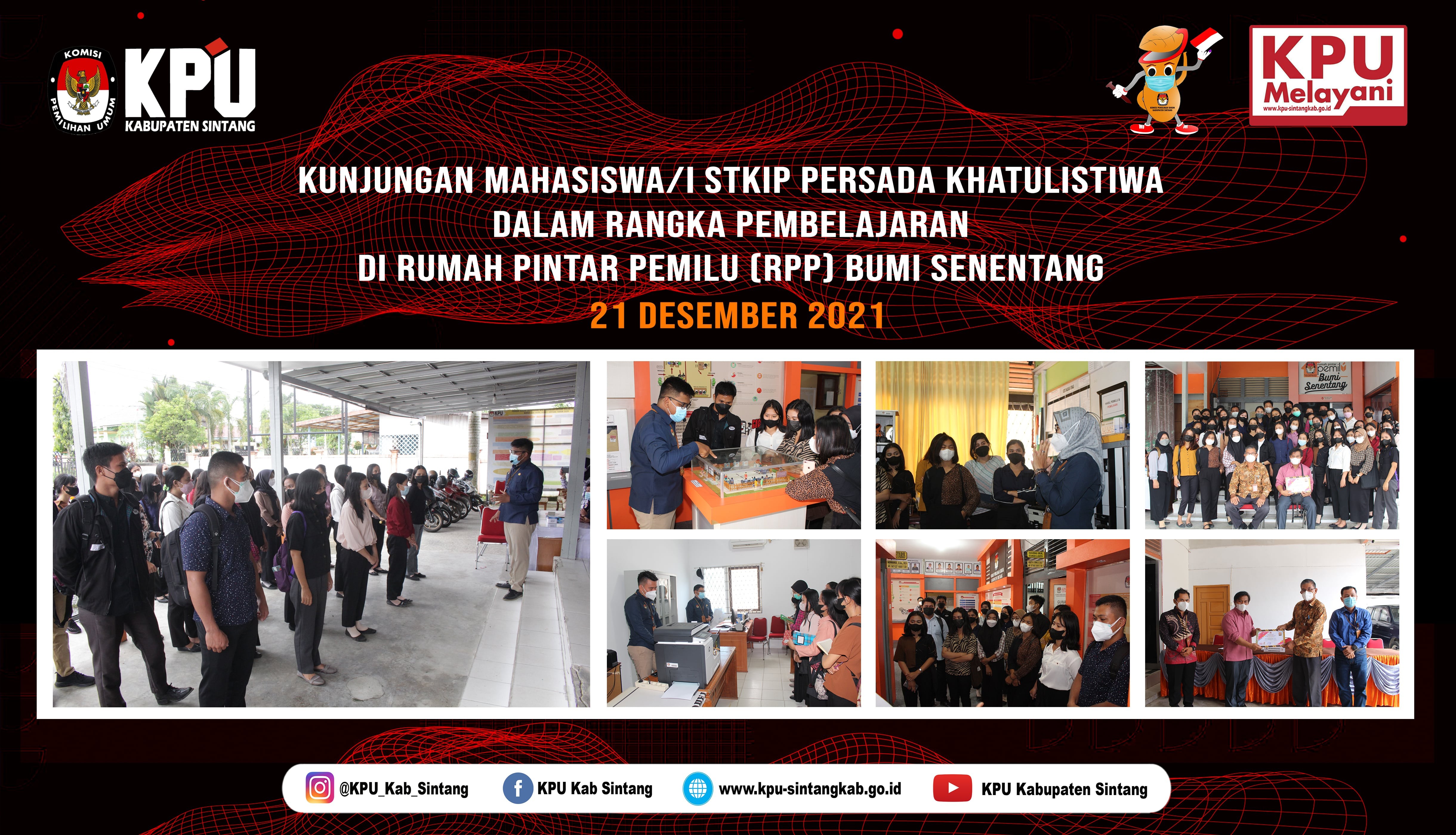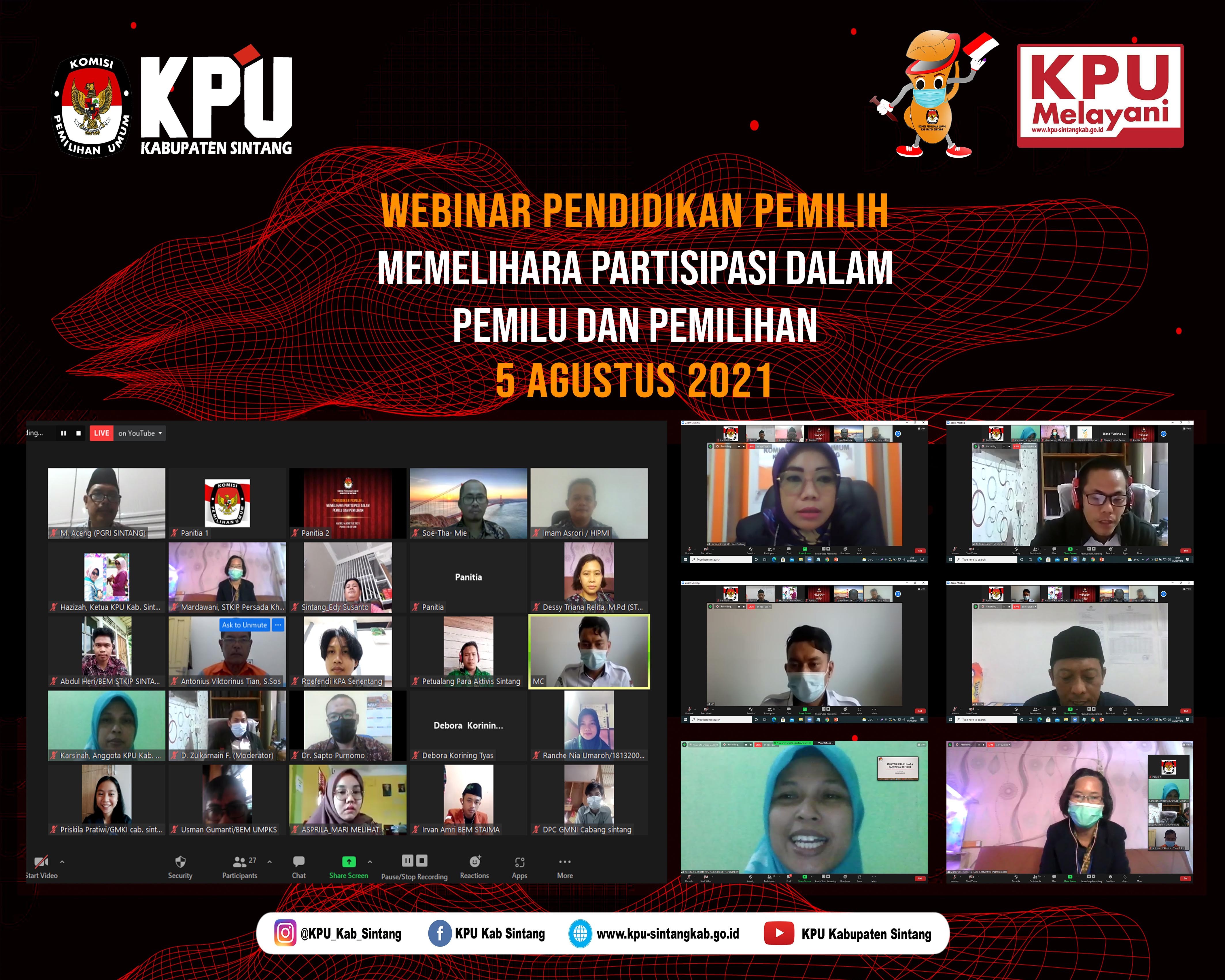 Komisi Pemilihan Umum (KPU) Kabupaten Sintang menyelenggarakan Kegiatan Webinar kedua Pendidikan Pemilih Kamis (05/08/2021) pukul 09.00 Wib s.d Selesai, menggunakan Aplikasi Zoom Meeting dan disiarkan secara Live Streaming di Youtube KPU Kabupaten Sintang. Webinar kedua ini dilaksanakan secara daring karena masih masa Pandemi Covid-19. Webinar kali ini mengangkat tema “ Memelihara Partisipasi Pemilih dalam Pemilu dan Pemilihan”. Adapun peserta Webinar yaitu PGRI Kab. Sintang, IGI Kab. Sintang, PGNU Kab. Sintang, BEM Universitas Kapuas Sintang, BEM STKIP Persada Khatulistiwa Sintang, BEM STIKes Kapuas Raya Sintang, BEM STAIMA Sintang, BEM Universitas Muhammadiyah Pontianak Kampus Sintang, BEM STT Khatulistiwa Sintang, PMII Kab. Sintang, HMI Kab. Sintang, DPC GMNI Kab. Sintang, PMKRI Kab. Sintang, GMKI Kab. Sintang, HIPMI Sintang, Komunitas Sintang Membaca, Komunitas Aku Belajar, Komunitas Mari Melihat, Komunitas Pecinta Alam Sintang dan Petualang Para Aktivis (TERAK).