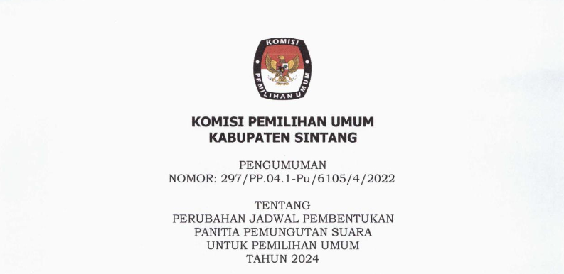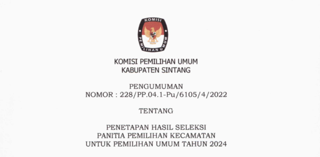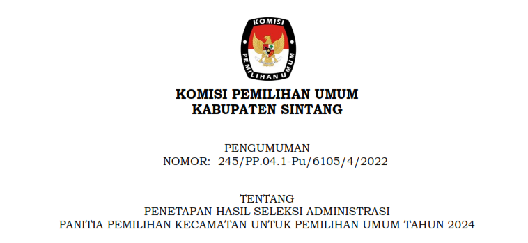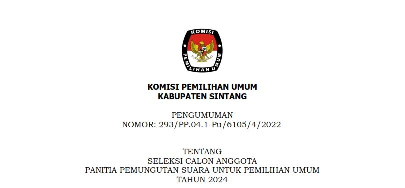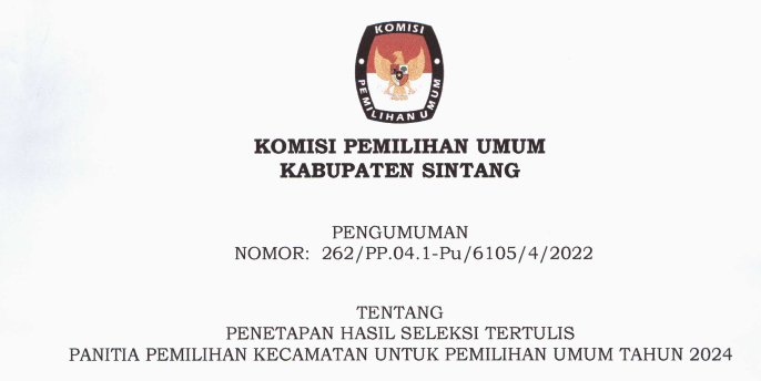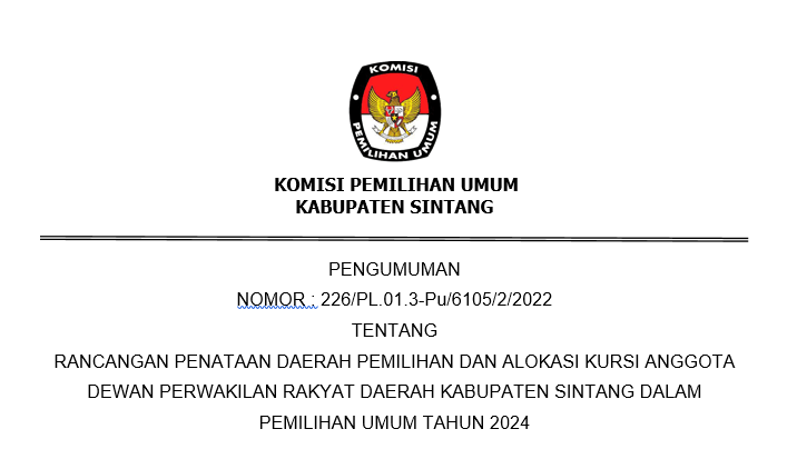 Berdasarkan pada Berita Acara Komisi Pemilihan Umum Kabupaten Sintang Nomor : 39/PL.01.3-BA/6105/2/2022 tentang Penetapan Rancangan Penataan Daerah Pemilihan dan Alokasi Kursi Anggota Dewan Perwakilan Rakyat Daerah Kabupaten Sintang Dalam Pemilihan Umum Tahun 2024, dengan ini mengumumkan Rancangan Penataan Daerah Pemilihan dan Alokasi Kursi Anggota Dewan Perwakilan Rakyat Daerah Kabupaten Sintang dalam Pemilihan Umum Tahun 2024 untuk dapat mendapatkan tanggapan dan masukan masyarakat sebagaimana tercantum dalam lampiran pengumuman ini.
