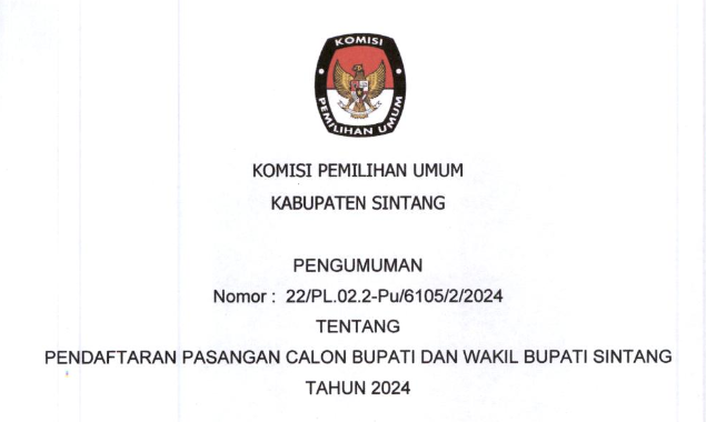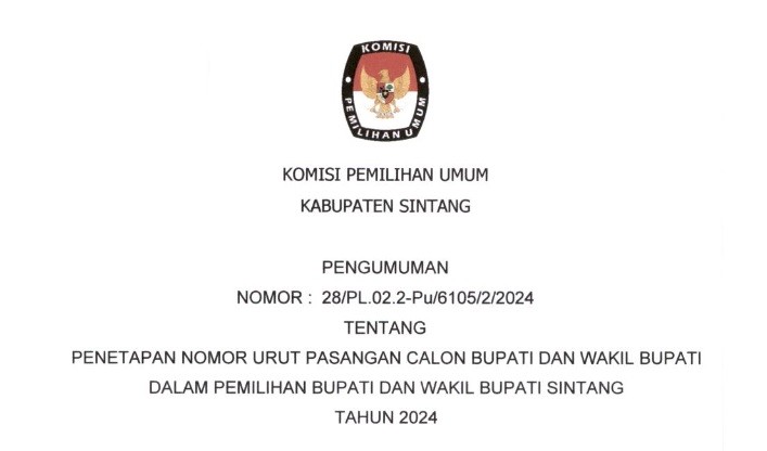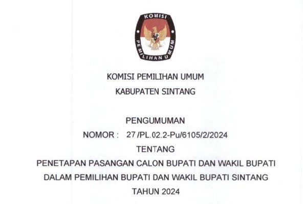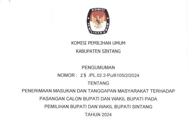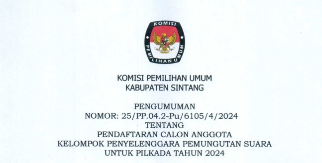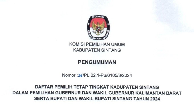 Sintang, kab-sintang.kpu.go.id - Pengumuman Nomor :26/PL.02.1-Pu/6105/3/2024 tentang Daftar Pemilih Tetap Tingkat Kabupaten Sintang dalam Pemilihan Gubernur dan Wakil Gubernur Kalimantan Barat serta Bupati dan Wakil Bupati Sintang Tahun 2024