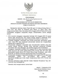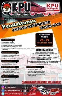 PENGUMUMAN Nomor : 867/PP.08.1.2-Pu/6105/KPU-Kab/XI/2018 PENDAFTARAN PESERTA KURSUS KEPEMILUAN TAHUN ANGGARAN 2018 Dalam rangka menumbuhkan peran aktif masyarakat dan menggerakkan kembali kesadaran berdemokrasi melalui Pemilihan Umum, KPU Kabupaten Sintang membuka pendaftaran menjadi Peserta Kursus Kepemiluan Tahun Anggaran 2018 dengan ketentuan : A. PERSYARATAN UMUM 1. Warga Negara Indonesia (WNI); 2. Berusia paling rendah 17 (tujuh belas tahun) tahun; 3. Berdomisili di wilayah Kabupaten Sintang; 4. Berpendidikan paling rendah sekolah lanjutan tingkat atas atau sederajat; 5. Peserta dibatasi sebanyak 20 orang untuk masing-masing gelombang. B. PERSYARATAN ADMINISTRASI 1. Fotokopi Kartu Tanda Penduduk (KTP) yang masih berlaku sebanyak 1 (satu) Lembar; 2. Fotokopi ijazah terakhir sebanyak 1 (satu) Lembar; 3. Pas Photo Ukuran 4 x 6 cm sebanyak 1 (satu) Lembar. C. PELAKSANAAN PENDAFTARAN 1. Waktu pendaftaran dimulai sejak tanggal 26 s/d 29 November 2018 di Kantor KPU Kabupaten Sintang, dan formulir pendaftaran dapat diambil dan diserahkan di kantor KPU Kabupaten Sintang Jl. Dr. Wahidin Sudirohusodo No.77 Sintang; 2. Pengumuman Peserta yang memenuhi syarat dapat dilihat di http://kpu-sintangkab.go.id dan di Papan Pengumuman di Kantor KPU Kabupaten Sintang pada tanggal 1 Desember 2018. D. PELAKSANAAN KURSUS 1. Gelombang I, dilaksanakan tanggal 4 Desember 2018 Pukul 07.30 s.d 16.30 WIB di Kantor KPU Kabupaten Sintang; 2. Gelombang II, dilaksanakan tanggal 5 Desember 2018 Pukul 07.30 s.d 16.30 WIB di Kantor KPU Kabupaten Sintang; 3. Pelaksanaan Kursus tidak dipungut biaya atau gratis. E. FASILITAS KURSUS 1. Seminar Kit; 2. Kaos; 3. Sertifikat. F. MATERI KURSUS 1. Pengenalan Kepemiluan; 2. Teknis Penyelenggaraan Pemilu; 3. Prinsip Dasar Partisipasi Pemilu; 4. Menangkal Hoax dalam Pemilu; Demikian pengumuman ini disampaikan untuk diketahui. Sintang, 9 November 2018 KETUA KOMISI PEMILIHAN UMUM KABUPATEN SINTANG, ttd HAZIZAH