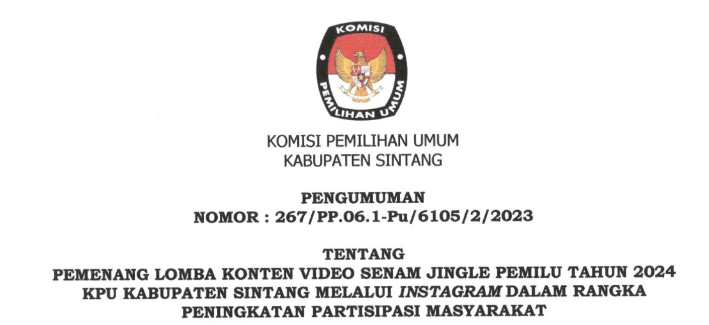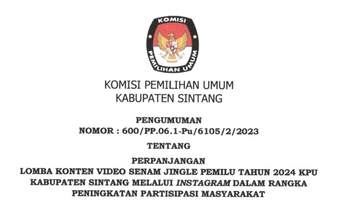 Sintang, kab-sintang.kpu.go.id - Pengumuman Nomor : 567/PP.06.1-Pu/6105/2/2023 tentang Lomba Konten Video Senam Jingle Pemilu Tahun 2024 KPU Kabupaten Sintang melalui Instagram dalam rangka Peningkatan Partisipasi Masyarakat.