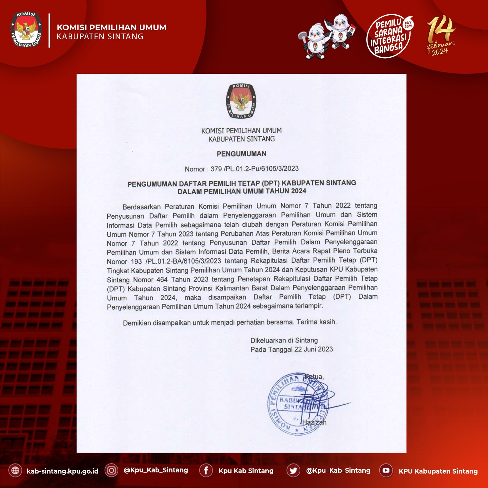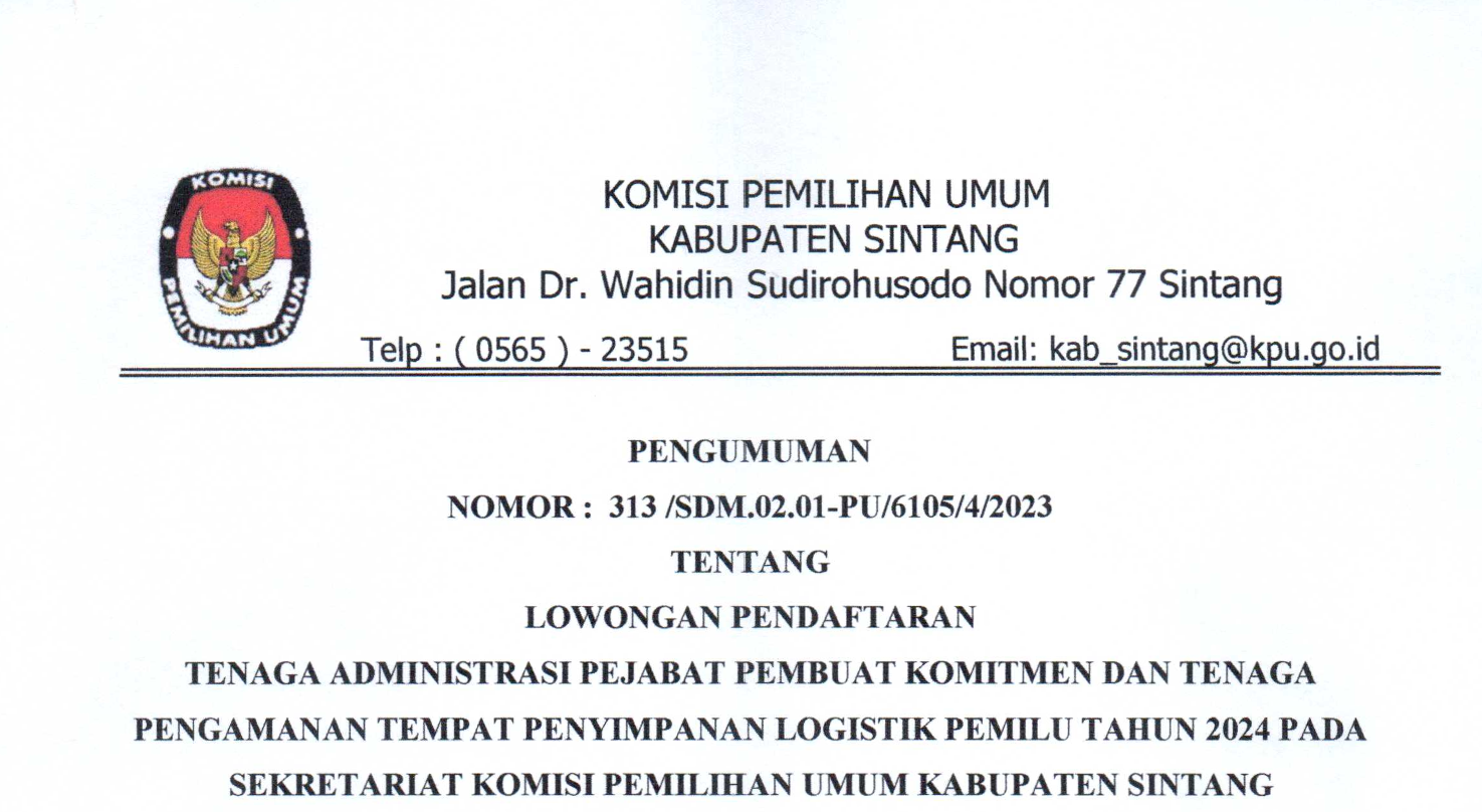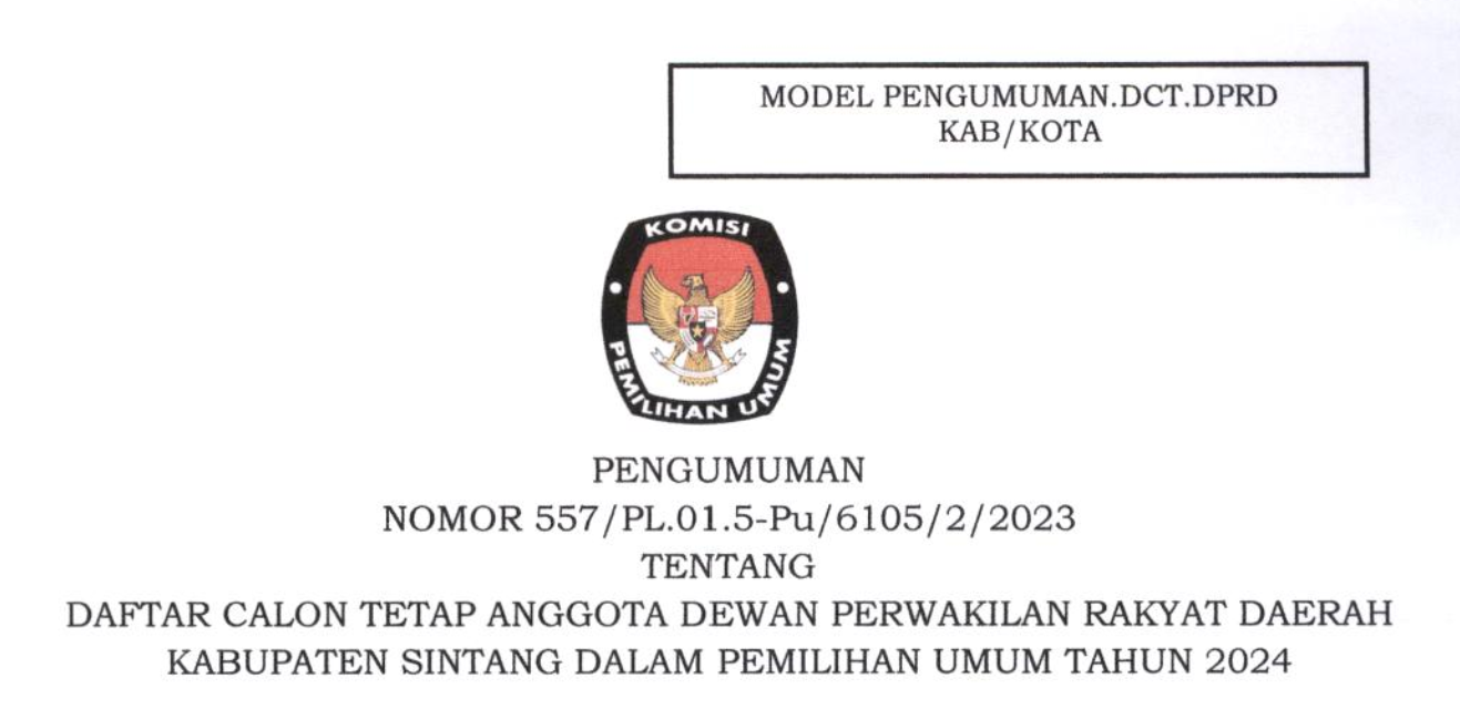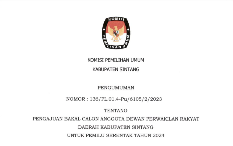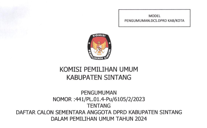 Sintang, kab-sintang.kpu.go.id - Bahwa untuk melaksanakan pelaksanaan pasal 70 PKPU Nomor 10 Tahun 2023 tentang Pencalonan Anggota DPR, DPRD Provinsi, DPRD Kabupaten/Kota, KPU Kabupaten Sintang mengumumkan Daftar Calon Sementara (DCS) Anggota DPRD Kabupaten Sintang dan persentase keterwakilan perempuan dalam DCS, sebagaimana terlampir KLIK DISINI