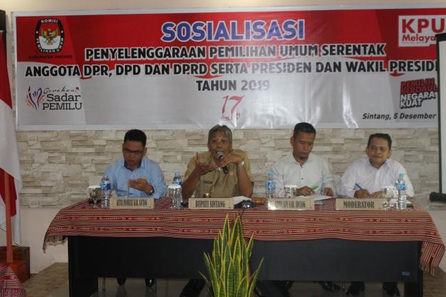 kpu-sintangkab.go.id – Komisi Pemilihan Umum (KPU) Kabupaten Sintang melaksanakan kegiatan Sosialisasi Tahapan Pemilihan Anggota DPR, DPD, dan DPRD serta Presiden dan Wakil Presiden tahun 2019 dengan Focus Group Discussion (FGD) dengan mengundang para Stakeholder Pemilu, Ormas dan LSM di Kabupaten Sintang. Acara dilaksanakan pada hari Selasa (5/12) di Hotel Bagoes Guest House Sintang, dimulai pada pukul 07.30 WIB yang dibuka secara langsung oleh Supranto Aji selaku ketua KPU Kabupaten Sintang. Hadir dalam acara ini sebagai narasumber adalah dr. Jarot Winarno, M.Med.PH selaku Bupati Sintang, Fransiskus, SH Ketua Panwaslu Kabupaten Sintang dan Supranto Aji Ketua KPU Kabupaten Sintang. Sebagai Narasumber pertama dr. Jarot Winarno, M. Med.PH menyampaikan materi tentang peran Pemerintah Daerah dalam penyelenggaraan Pemilihan Anggota DPR, DPD dan DPRD serta Presiden dan Wakil Presiden Tahun 2019. Beliau memaparkan 7 item peran Pemerintah Daerah Kabupaten Sintang dalam Pemilihan Umum yaitu: Penugasan personel pada sekretariat PPK, Panwaslu Kecamatan dan PPS; Penyediaan sarana ruangan sekretariat PPK, Panwaslu Kecamatan dan PPS; Sosialisasi terhadap peraturan dan Perundang-undangan Pemilu; Pelaksanaan Pendidikan Politik bagi pemilih untuk meningkatkan partisipasi masyarakat dalam pemilu; Kelancaran transportasi pengiriman logistik; Pemantauan kelancaran penyelenggaraan Pemilu; Kegiatan lain yang sesuai dengan kebutuhan pelaksanaan pemilu. Untuk memperkuat peran Pemda dalam pemilu dr. Jarot Winarno, M. Med.PH akan melakukan langkah-langkah antisipasi dalam pemilu 2019 di Kabupaten Sintang antara lain: Memperkuat peran FORUM KOORDINASI PIMPINAN DAERAH untuk mendeteksi kerawanan pemilu; Mengoptimalkan fungsi koordinasi antara Pemda dengan KPUD dan Bawaslu untuk mengantisipasi berbagai perkembangan dalam semua tahapan Pemilu; Melakukan sosialisasi aturan pemilu kepada masyarakat, aparat Pemda dan Instansi terkait; Melakukan monitoring untuk semua tahapan Pemilu; Mendorong seluruh OPD untuk melaksanakan kewajiban membantu dan memfasilitasi penyelenggaraan Pemilu; Melakukan Pendidikan Politik secara terpadu kepada pemilih agar partisipasi politik masyarakat dapat optimal. Sementara itu Fransiskus, SH Ketua Panwaslu Kabupaten Sintang dalam paparannya menyampaikan tentang peran Bawaslu baik dari tingkat RI, Provinsi, Kabupaten/Kota maupun pengawas di tingkat KPPS. Mengacu pada Undang-Undang Pemilu memang peran pengawasan dan penindakan atas pelanggaran pemilu yang dilakukan oleh penyelenggara maupun kontestan pemilu menjadi domain utama dari Bawaslu. Selain itu juga beliau juga memaparkan poin-poin kerjasama pengawasan yang dibangun dengan Stakeholder antara lain: Kerjasama dan Koordinasi; Sosialisasi; Partisipasi; Peringatan Dini; Publikasi. Dengan adanya kerjasama pengawasan tersebut beliau mengharapkan output yang akan dihasilkan dalam bentuk pencegahan (berorientasi pada hasil), penindakan berorientasi pada Proses, kewenangan penindakan pelanggaran Pemilu oleh Pengawas Pemilu yang diatur dalam UU No.7/2017 dan UU No.1/2015 junto UU No. 08/2015 junto UU No.10/2016 yaitu : a. Rekomendasi kepada KPU sesuai tingkatan; b. Rekomendasi ke Penyidik Polri; c. Rekomendasi ke DKPP Sementara itu Ketua KPU Kabupaten Sintang Supranto Aji memaparkan tentang Tahapan Penyelenggaraan Pemilihan Anggota DPR, DPD dan DPRD serta Presiden dan Wakil Presiden Tahun 2019, sesuai dengan peraturan KPU Nomor 7 Tahun 2017. Dalam penyampaiannya Supranto Aji mengatakan dengan adanya sosialisasi ini diharapkan kepada para Stakeholder dapat sama-sama mencermati seluruh tahapan, terutama tahapan yang krusial seperti data pemilih yang menjadi titik tolak bagaimana kualitas pemilu yang dilaksanakan. Jika data pemilih ini bermasalah, maka pemilunya juga akan banyak masalah dikemudian hari, ujarnya. Kegiatan sosialisasi ini berlangsung sangat interaktive dan hidup dengan komunikasi dua arah antara narasumber dan undangan yang dihadiri antara lain Pimpinan Partai Politik yang ada di Kabupaten Sintang, Pimpinan Organisasi Kemasyarakatan di Kabupaten Sintang, Kepala Dinas Kependudukan dan Catatan Sipil Kabupaten Sintang dan Kepala Badan Kesatuan Bangsa dan Politik (Kesbangpol) Kabupaten Sintang. (Teknis & Hupmas KPU Sintang)