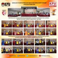 Setelah mengalami penundaan Tahapan Pemilihan karena Pandemi Covid-19, Komisi Pemilihan Umum (KPU) Kabupaten Sintang melaksanakan kembali kegiatan sosialisasi Tahapan Pencalonan Pemilihan Bupati dan Wakil Bupati Sintang Tahun 2020 di Hotel My Home, Rabu (8/7/2020), yang dihadiri oleh Forkopimda Kab. Sintang, Pimpinan Partai Politik Tingkat Kab. Sintang, , Bawaslu Kab. Sintang, Instansi terkait, dan beberapa perwakilan dari Media massa. Acara dibuka oleh Anggota KPU Kab. Sintang Divisi Hukum, Antonius Viktorianus Tian, yang dalam sambutan nya memwakili Ketua KPU Kab. SIntang mengatakan bahwa KPU Kab. Sintang sudah siap untuk menyelenggarakan Pemilihan Bupati dan Wakil Bupati Sintang tahun 2020 di masa Pandemi Covid-19, dimana dalam setiap Tahapannya akan selalu memperhatikan Protokol Kesehatan. Kesiapan itu ditunjukkan dengan telah terlaksananya sejumlah kegiatan sesuai dengan Panduan Tahapan, jadwal dan Program yang sudah ditetapkan oleh KPU RI. “Kita sudah siap melaksanakan semua tahapan sesuai Program dan jadwal yang telah ditetapkan. Adapun maksud kegiatan Sosialisasi hari ini adalah untuk menginformasikan tahapan-tahapan dan persyaratan pencalonan Pemilihan Bupati dan Wakil Bupati Sintang Tahun 2020 kepada Partai Politik dan masyarakat, sehingga diharapkan semua yang berkepentingan bisa mempersiapkan diri sedini mungkin,” ujar Antonius V. Tian. Pada acara pembukaan tersebut dilaksanakan penyerahkan Surat Keputusan (SK) KPU Kabupaten Sintang Nomor: 6/PL.02.2-Kpt/6105/KPU-Kab/II/2020 tentang Penetapan Persyaratan Pencalonan untuk Partai Politik atau Gabungan Partai Politik dalam Pemilihan Bupati dan Wakil Bupati Sintang Tahun 2020 kepada Forkopinda, Bawaslu Kab. Sintang, dan Partai Politik Tingkat Kab. Sintang. Pemateri kegiatan sosialisasi Tahapan Pencalonan yang juga Anggota KPU Kab. Sintang Divisi Teknis Penyelenggaraan, Sutami memaparkan materi yang menjelaskan tentang: a. Tahapan Pendaftaran; b. Syarat Pencalonan; c. Pendaftaran; d. Syarat Calon; e. Verifikasi dan Klarifikasi Dokumen Syarat Calon; f. Penetapan;dan g. Pengundian Nomor Urut. Pada poin tentang syarat Pencalonan dan Waktu Pendaftran Calon, Sutami menjelaskan bahwa pengumuman pendaftran paslon dimulai tanggal 28 agustus s.d 3 september 2020, dengan masa pendaftaran Paslon yaitu dari tanggal 4 s.d 6 September 2020. “Untuk Syarat Pencalonan yang diusulkan dari Partai Politik atau Gabungan Partai Politik yang memperoleh paling sedikit 20% dari jumlah kursi DPRD hasil Pemilu Terahir atau 25% dari akumulasi perolehan suara sah seluruh Parpol dalam Pemilu anggota DPRD pemilu terakhir”, jelas Sutami. (Teknis & Hupmas KPU Sintang)